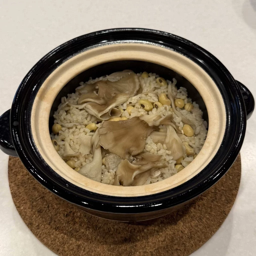 土鍋で炊いた舞茸と大豆の炊き込みご飯が美味しすぎて何倍でも食べられる。ちなみに、お米はササニシキの五分づき。