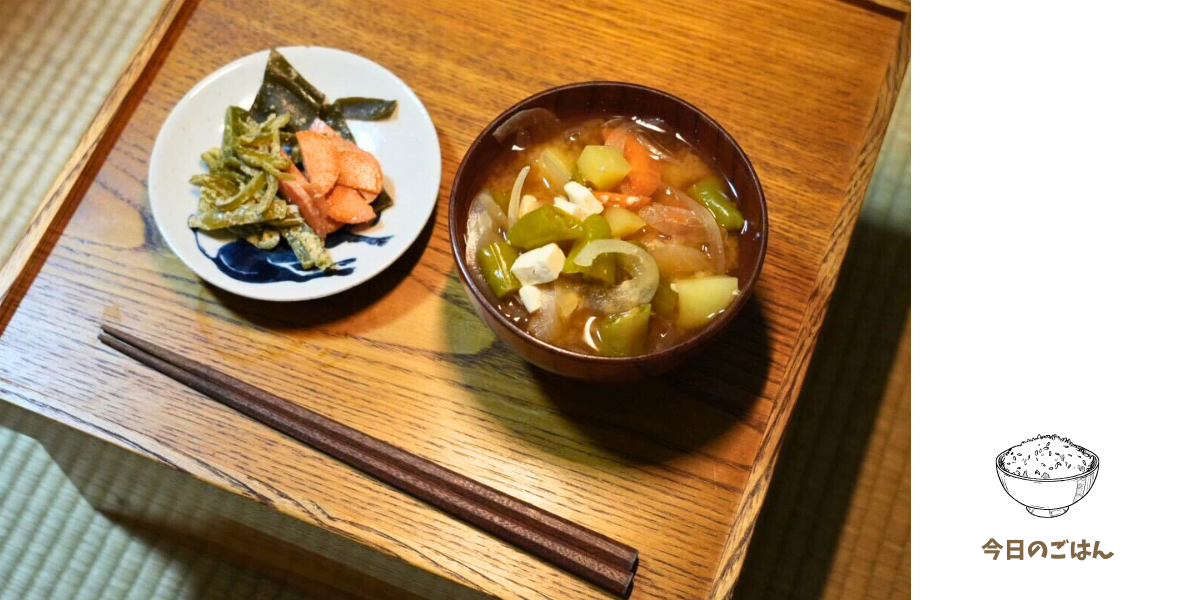 - 味噌汁(出汁:鰹節、昆布|具:ジャガイモ、玉ねぎ、にんじん、シシトウ)